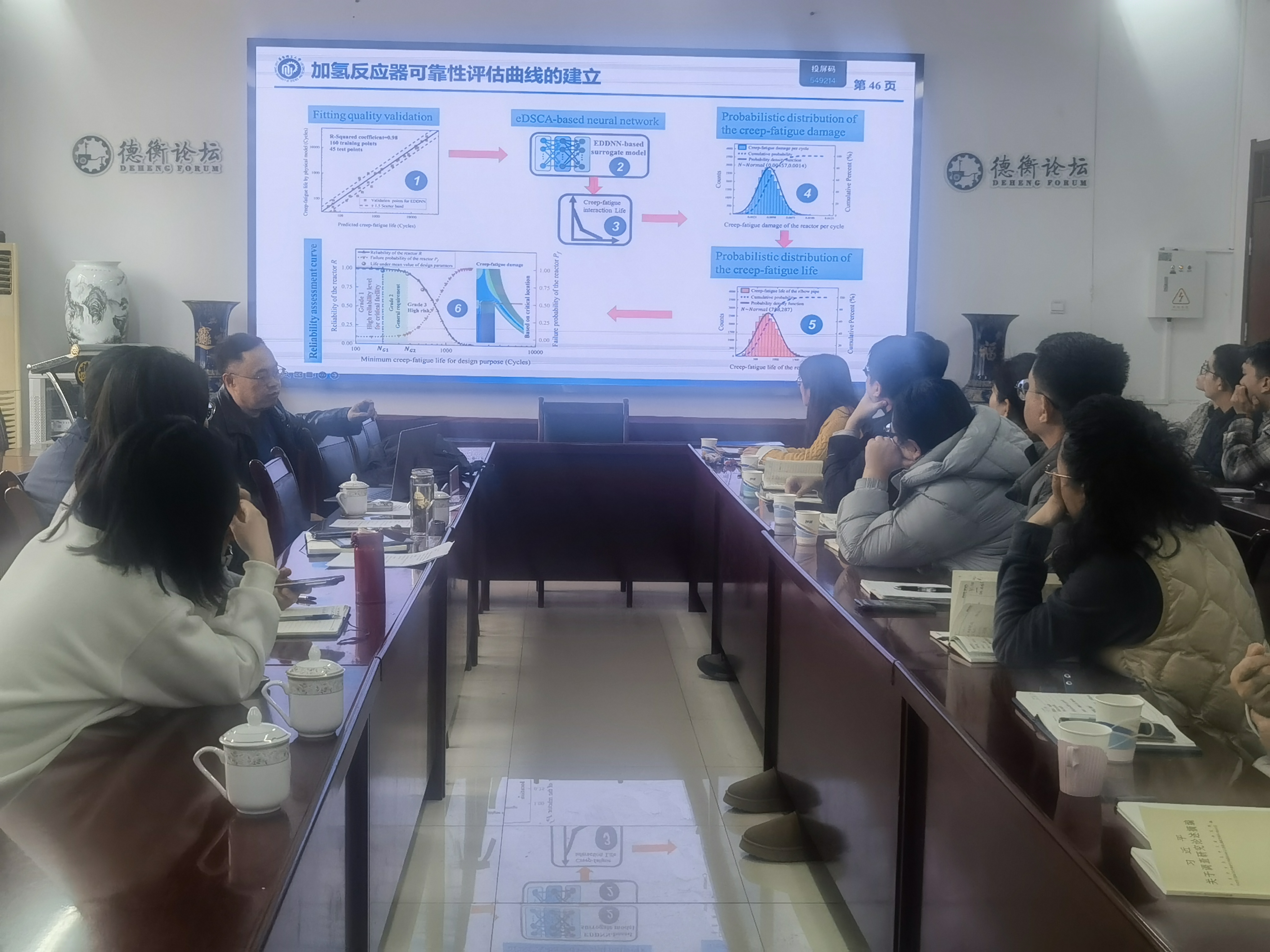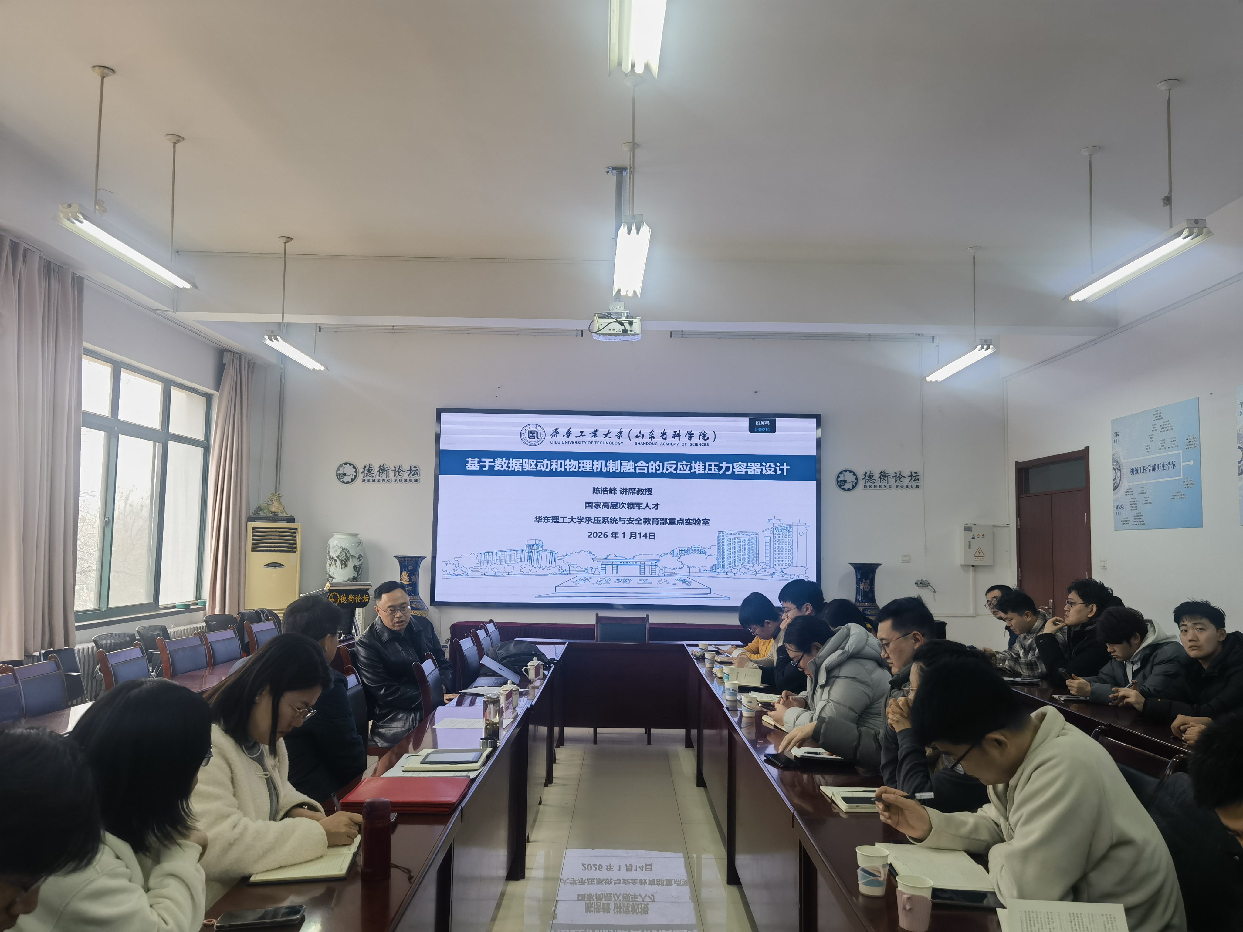 随后陈浩峰教授以《基于数据驱动和物理机制融合的反应堆压力容器设计》为题给大家做了精彩的学术分享。其从选题方式到科研过程娓娓道来,为大家系统而全面的展示了研究思路和相关成果。报告围绕反应堆结构强度与寿命设计的智能化趋势,系统阐述了数据科学、人工智能与物理建模相结合的前沿方法在高温高压设备完整性评估与安全运维中的创新应用。陈浩峰教授在报告中指出,随着大数据、人工智能与传感技术的快速发展,传统依赖物理规则的设计方法正逐步向“数据+物理”混合建模范式演进。